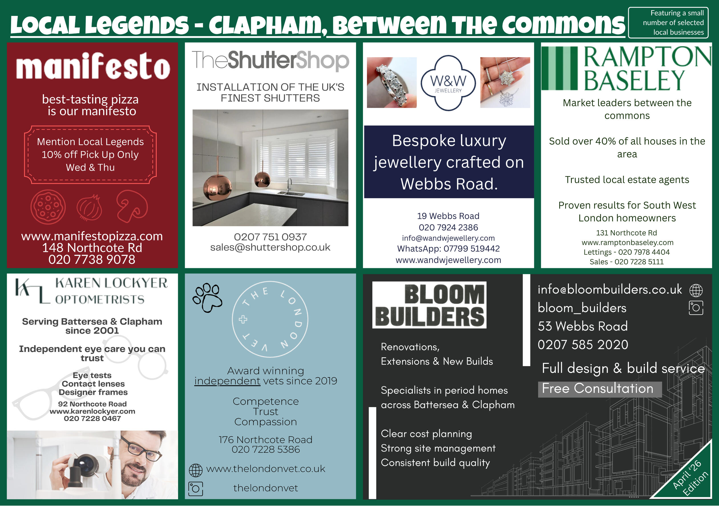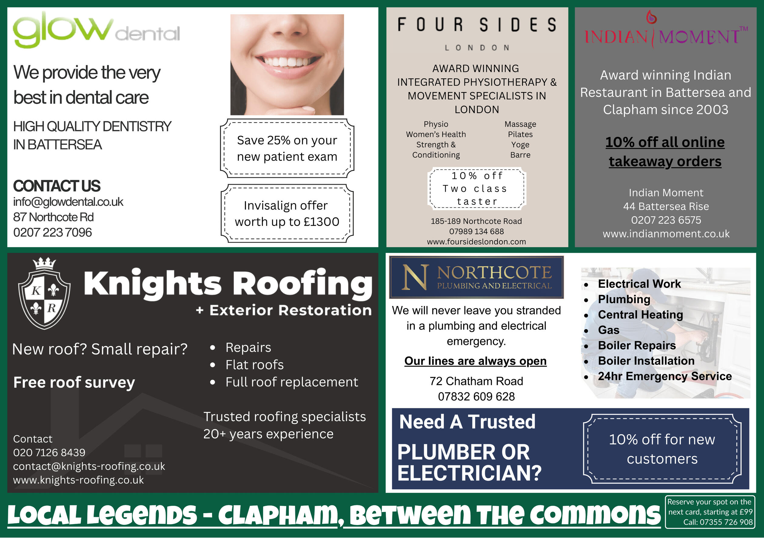 Below is an example of the Local Legends postcard featuring trusted local businesses serving Clapham and Battersea.Each edition highlights highly rated local services and is delivered directly to households across the area.
